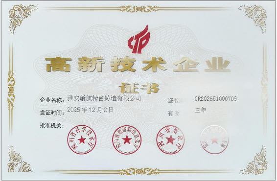 喜报|雅安新航获得国家高新技术企业证书2025年12月2日,雅安新航精密铸造有限公司(以下简称公司)荣获四川省科学技术厅、四川省经济和信息化厅、四川省财政厅、国家税务总局四川省税务局联合颁发的“高新技术企业”证书。2026年1月20日雅安市名山区科学技术局王局长及区科协王主席两位领导向公司授予了该项荣誉证书。公司总工程师杨勇、总工艺师蔡立新同志代表公司接受了荣誉证书。